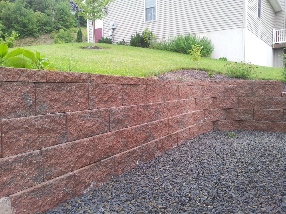 In this picture we used the natural slopes of the terrain to produce an eye-pleasing landscape architecture with retaining and freestanding walls that maintain pleasant curves. We combined a wide range of shapes, colors, and textures to create a unique flow that enhances the natural surroundings, transforming what was once unusable space into a place of gathering. This retaining and freestanding wall system is built to be extremely durable.